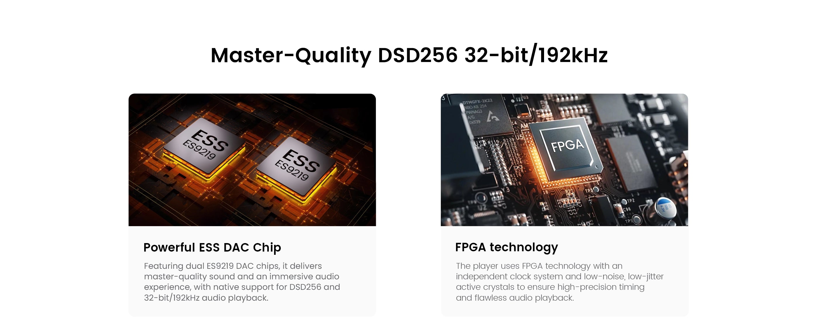 - Dual ES9219C DACs: Delivers studio-quality sound with native DSD256 support.