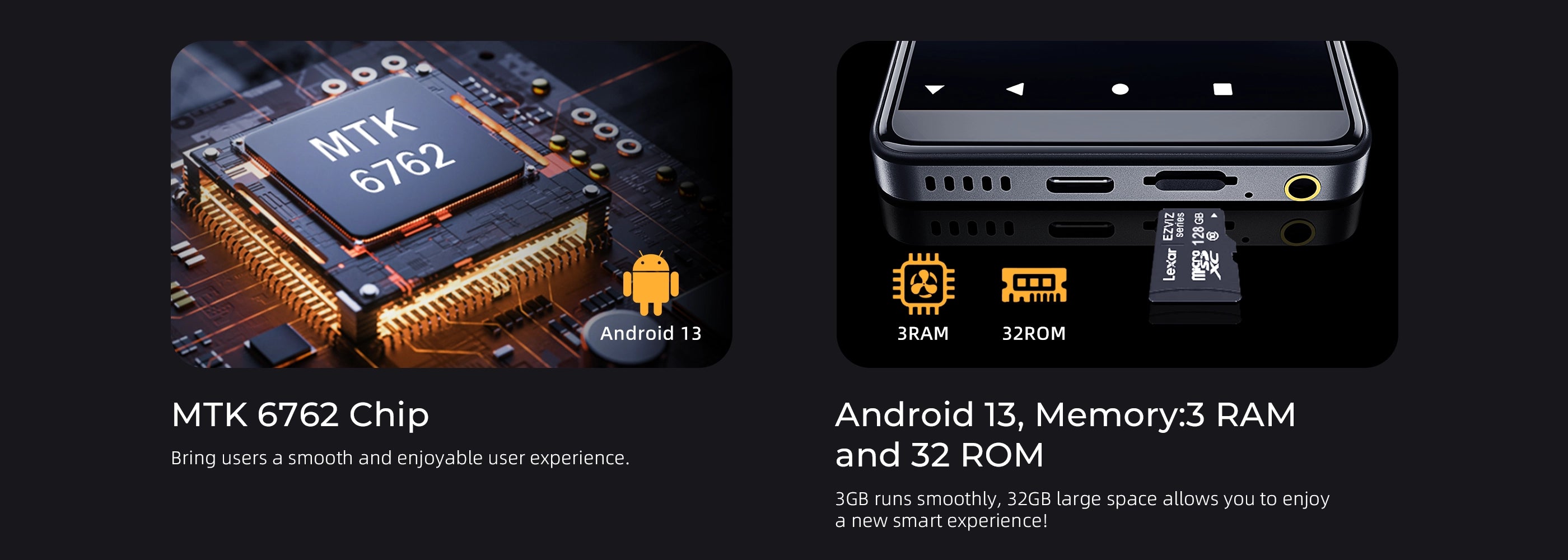 - Android 13 Powerhouse – 8-core 2 GHz chip and 3 GB RAM open apps in a snap and switch without lag—like a pocket-sized phone made just for music.